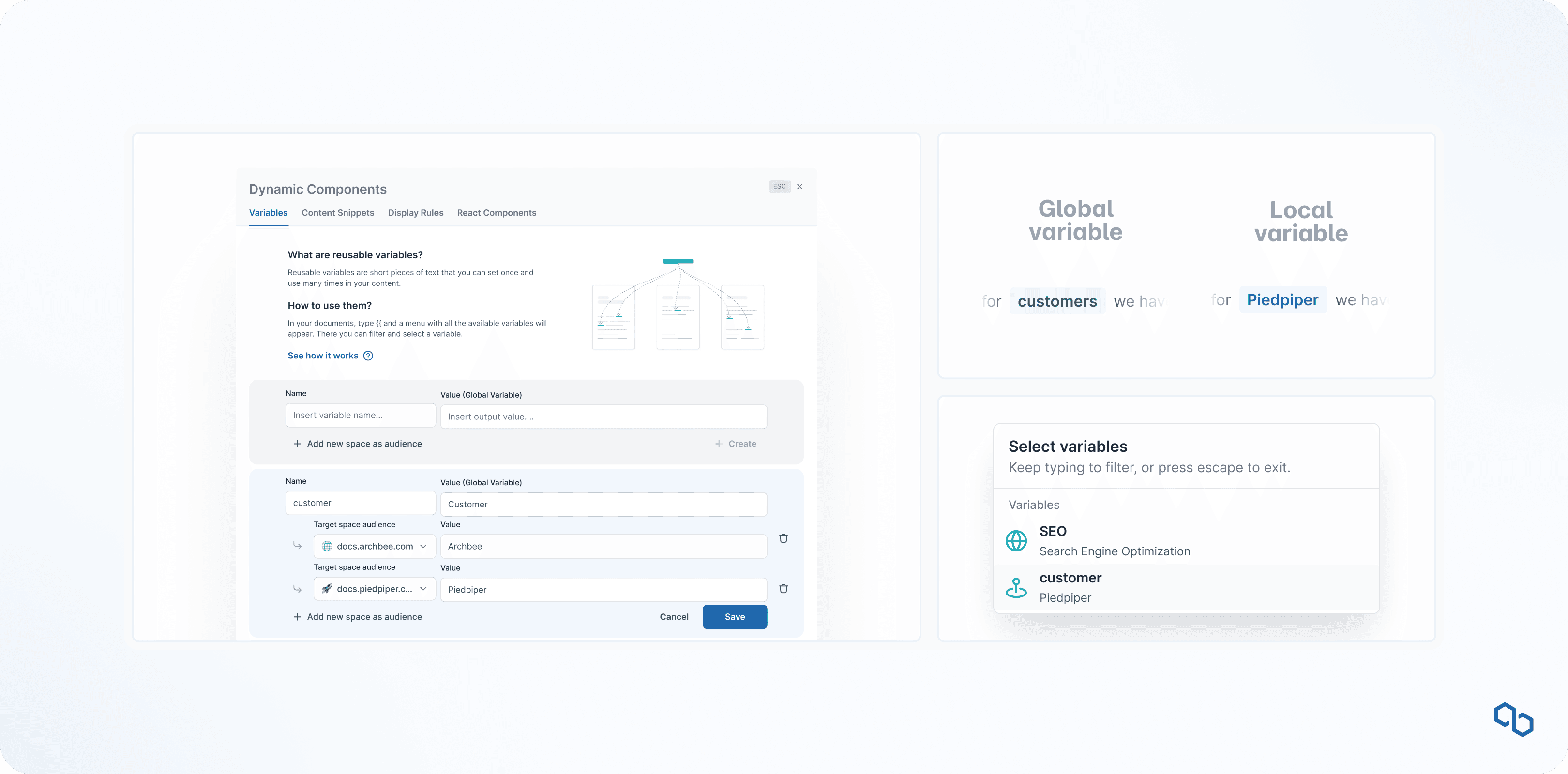 Customize content for each space. Create a single variable that can have different values in different spaces. Use it to personalize names for customers or any other content, making your content more relevant to each audience.