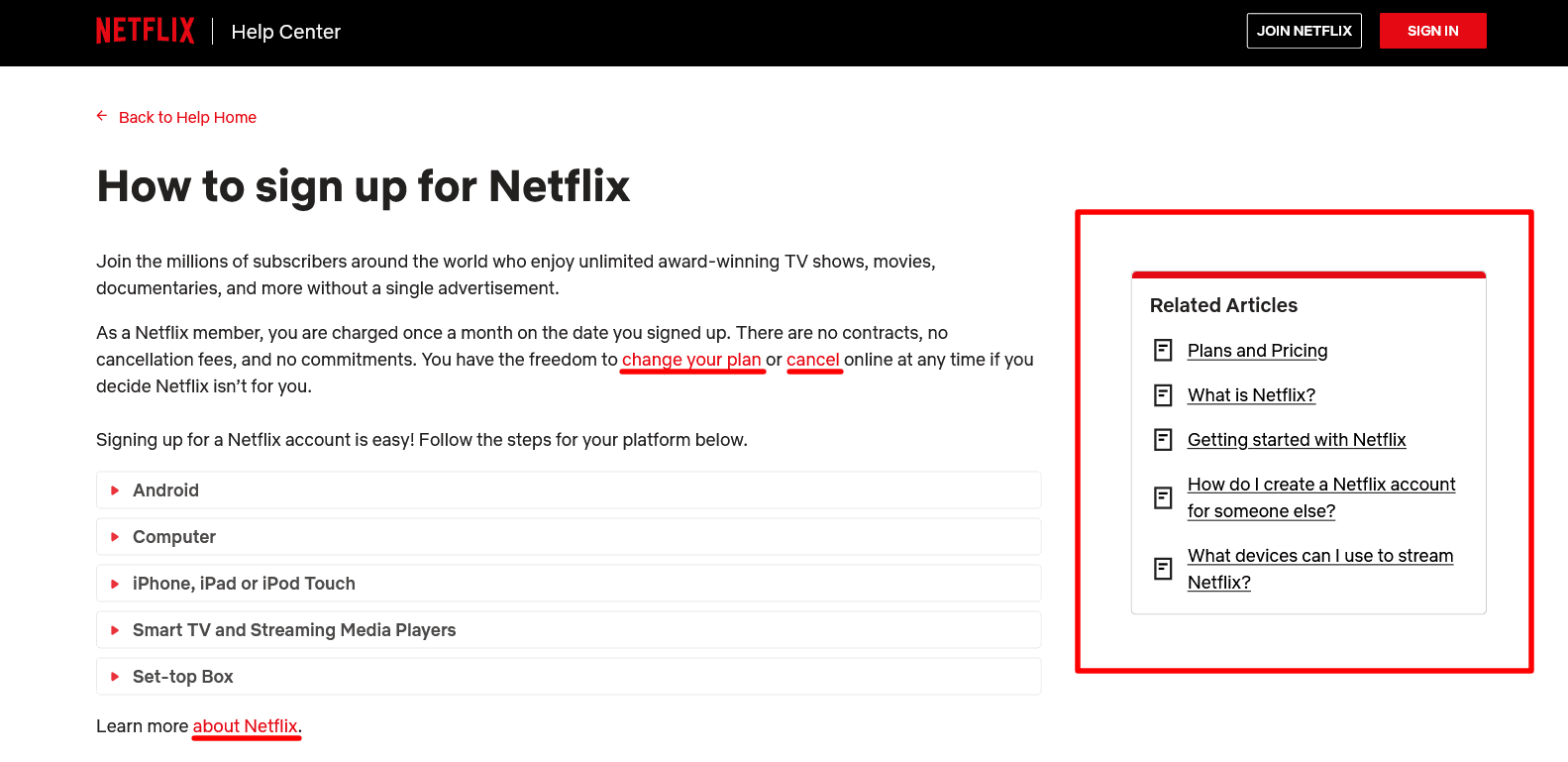 That way, when a user learns how to sign up to Netflix, they can, for instance, check out plans and pricing or read up on what device they need to stream their content.