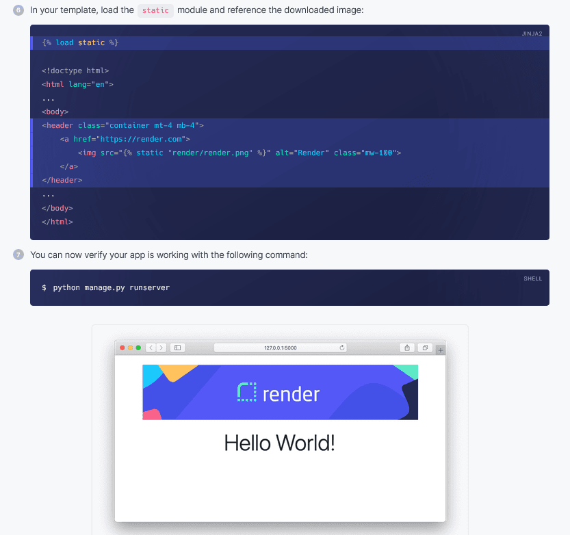 For example, Render has different quickstart guides for various programming languages and frameworks.