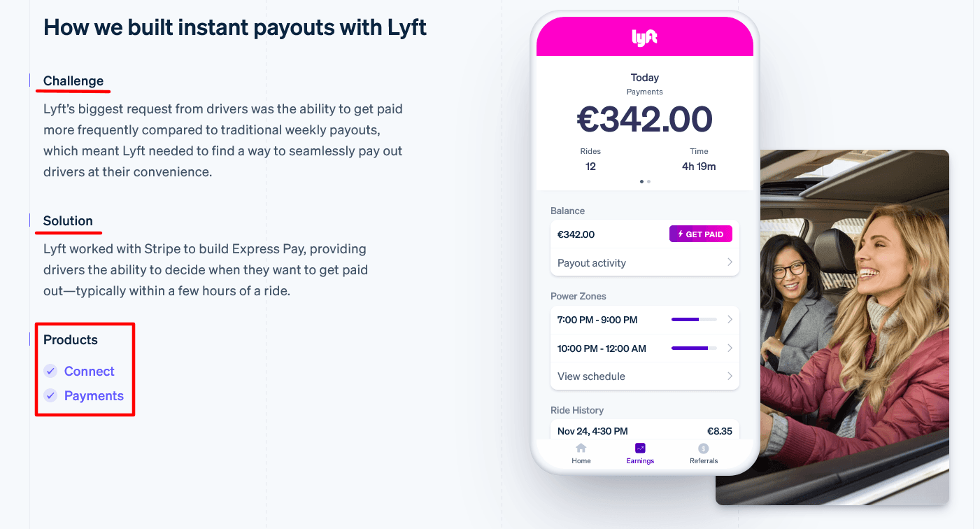 All of their stories have a similar structure—they present the customer’s challenge, how they solved it with Stripe, and what Stripe products they’ve used to do it.