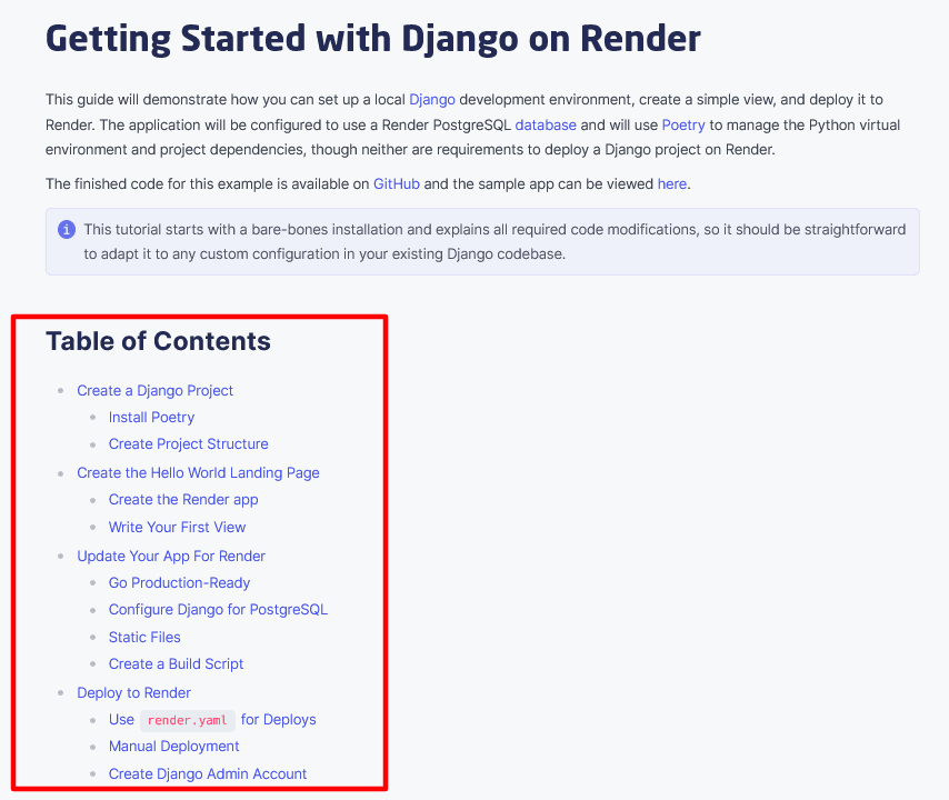 For instance, as you can see above, at the start of a tutorial, there’s a brief introduction and a table of contents that help with the initial experience of using the documentation.