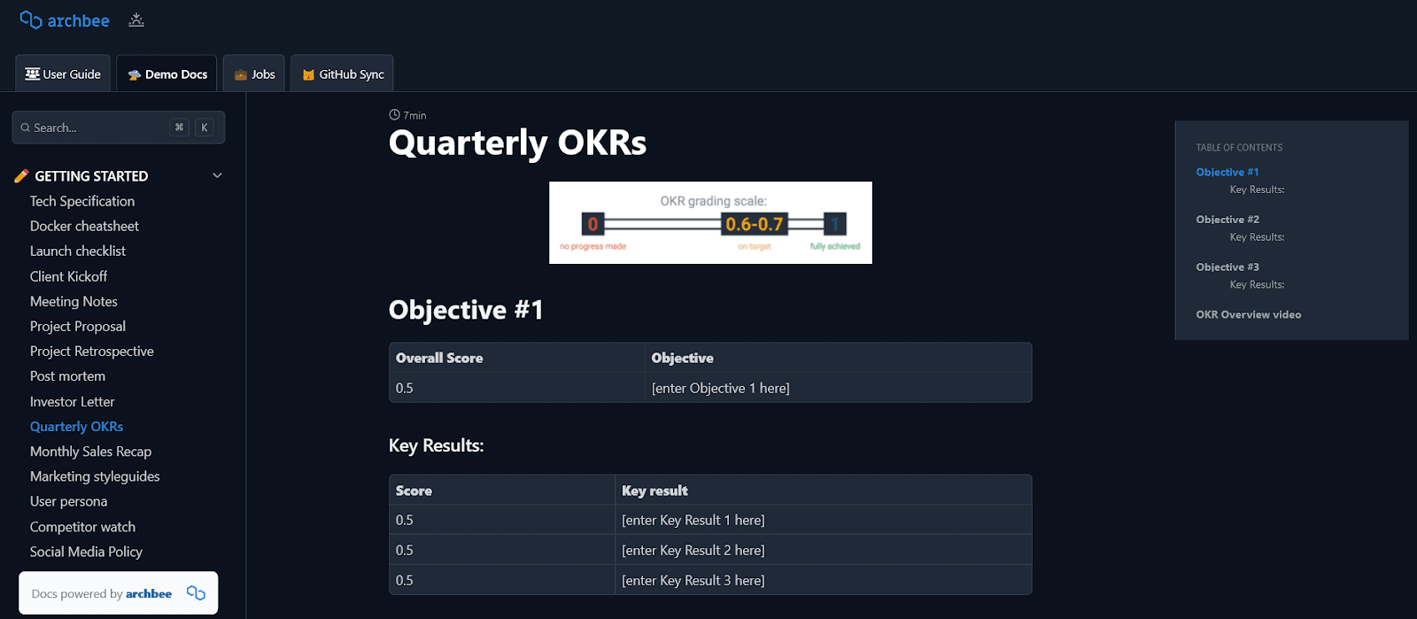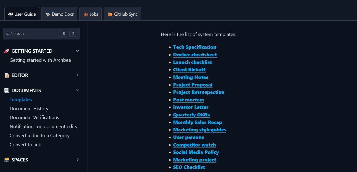 Archbee has technical writing templates that fall under several categories—Engineering, Marketing, Product, Sales, and Executive. Below is a full list of ready-made templates.