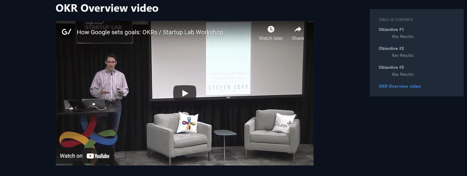 For example, Media blocks let you import images, embed YouTube videos like the one below about OKRs, etc.