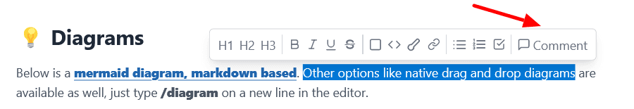 Commenting is possible on any part of the text—after you highlight a section, the option to write a comment appears.