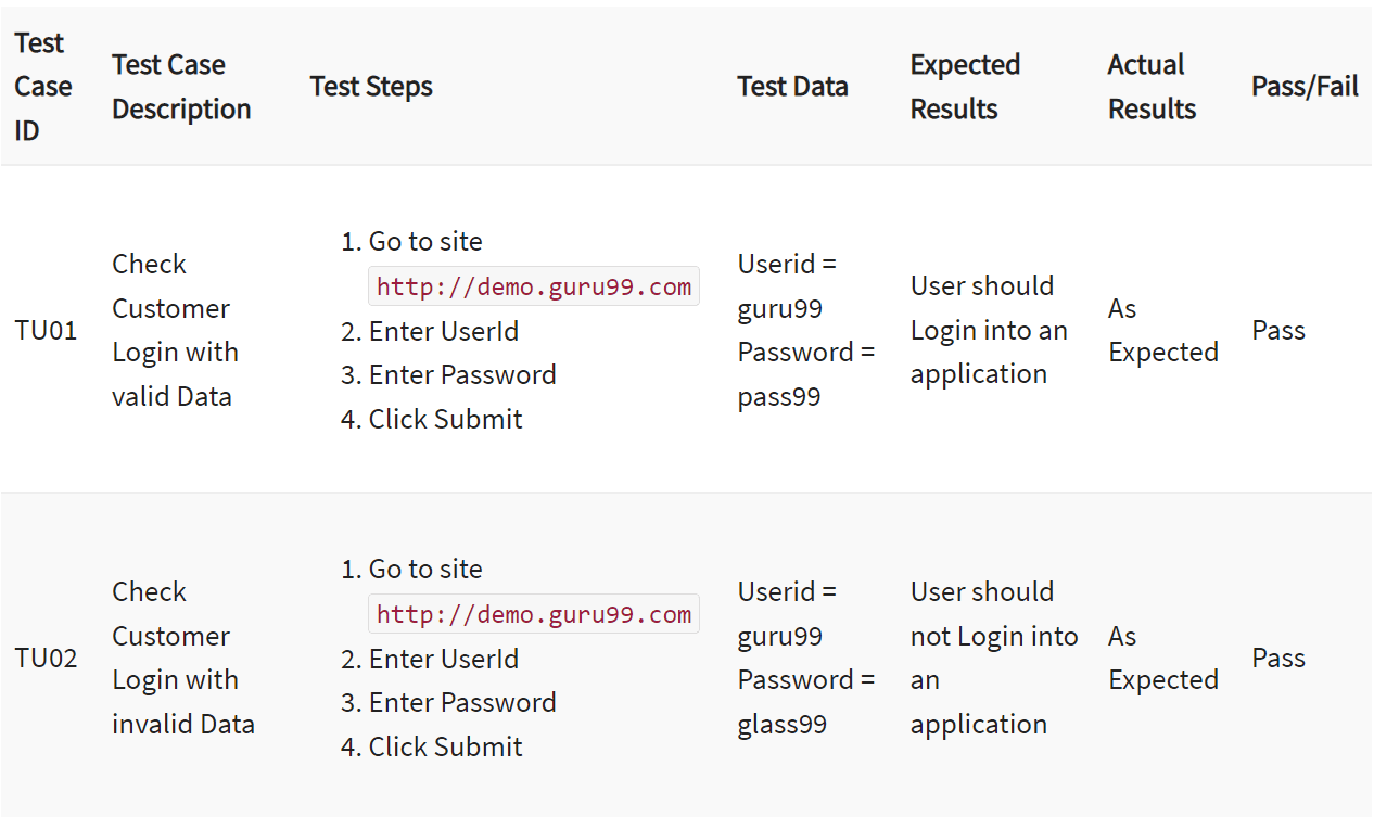Finally, the expected results describe what happens when the test is administered, which constitutes a “Pass” for this test case.