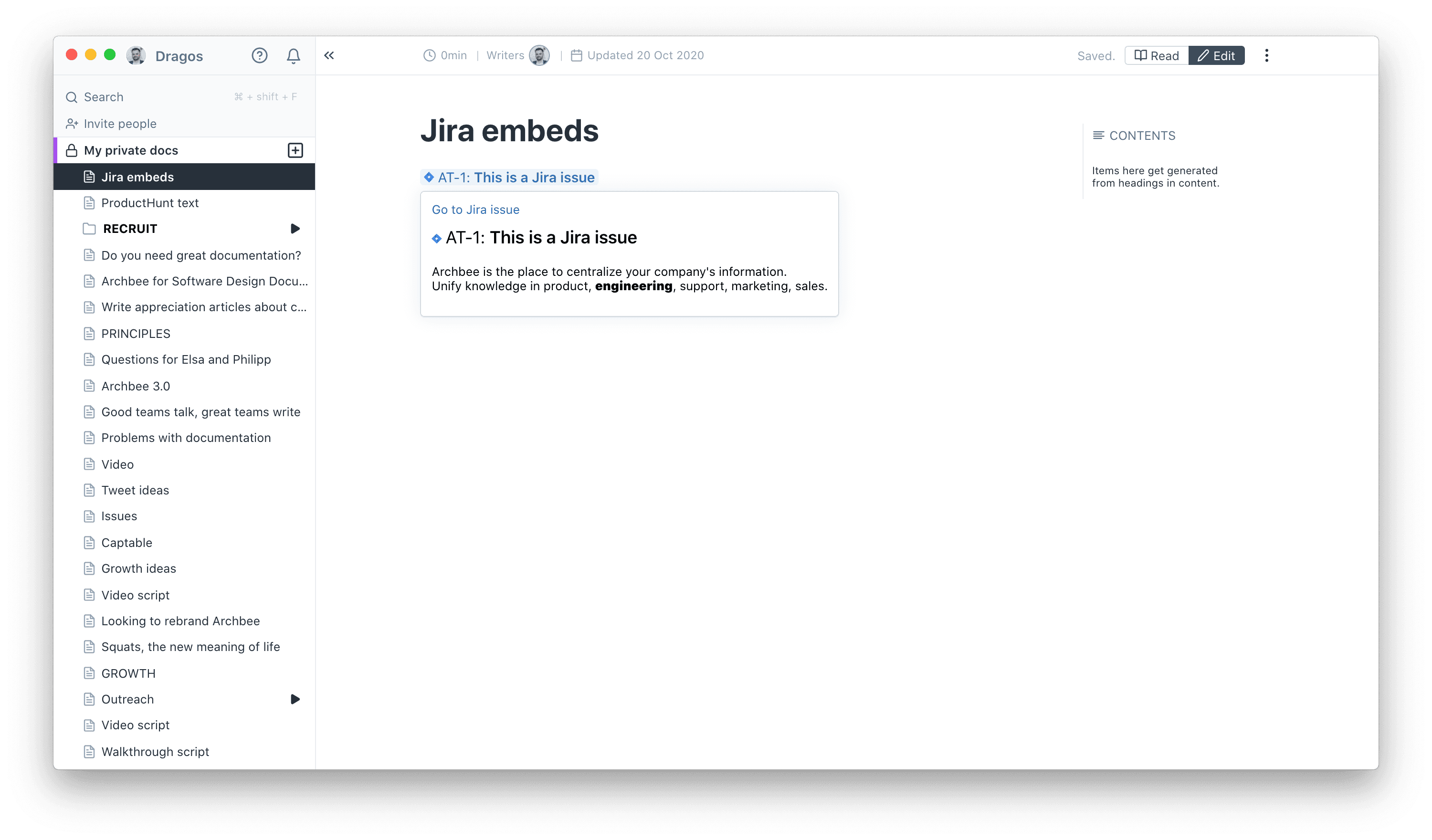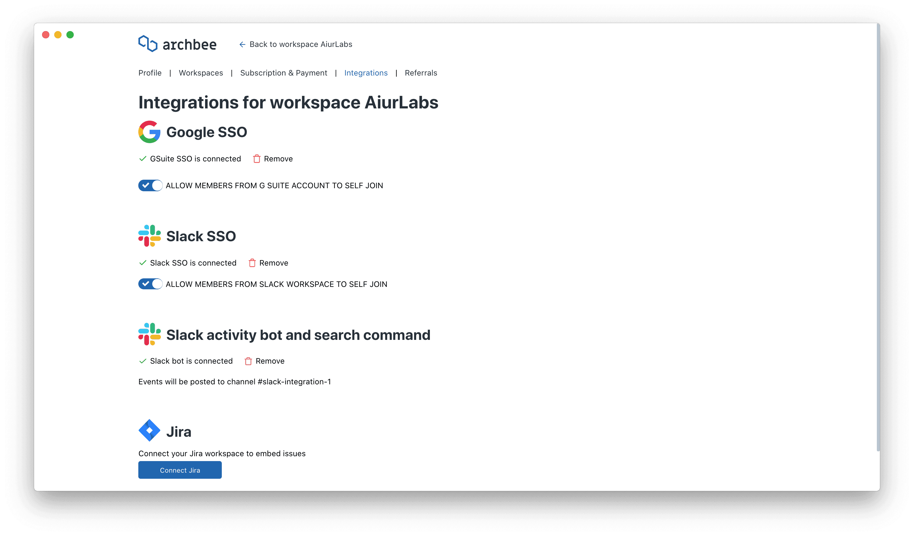 To activate it, go to https://app.archbee.com/settings/team-integrations, click Connect Jira and you'll be redirected to JIRA to approve our app.