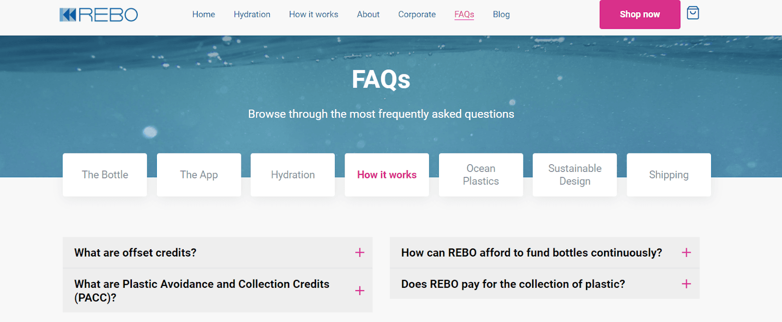 Even commonplace physical products, such as water bottles, often have FAQ sections. Here’s a screenshot of one created by the brand REBO.