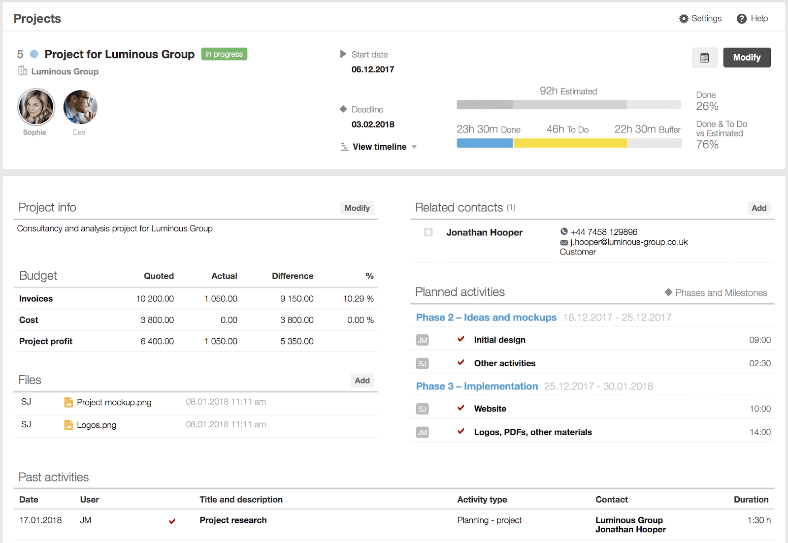 It has all the basic project management functions, like activity tracking and work scheduling, but it also comes with budgeting features that allows you to plan billable and non-billable activities, and keep track of invoices and expenses.