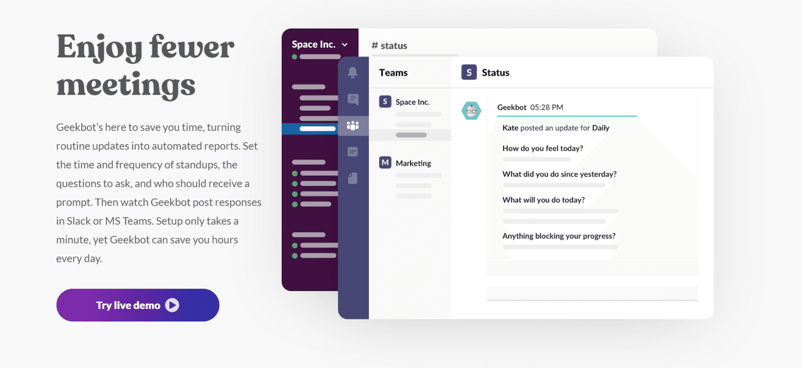 Each morning at 10 am (in their own timezone), the writers get a message from a chatbot on Slack that asks them for a progress report on their work and what they have planned for the day.