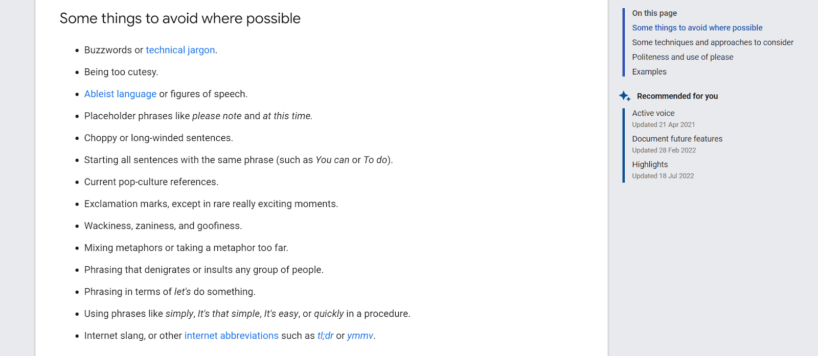 For example, if you’re using the Google developer documentation style guide, the writer checking another writer’s work can refer to the style guide if they notice that the document sounds off-brand or inappropriate in some places.