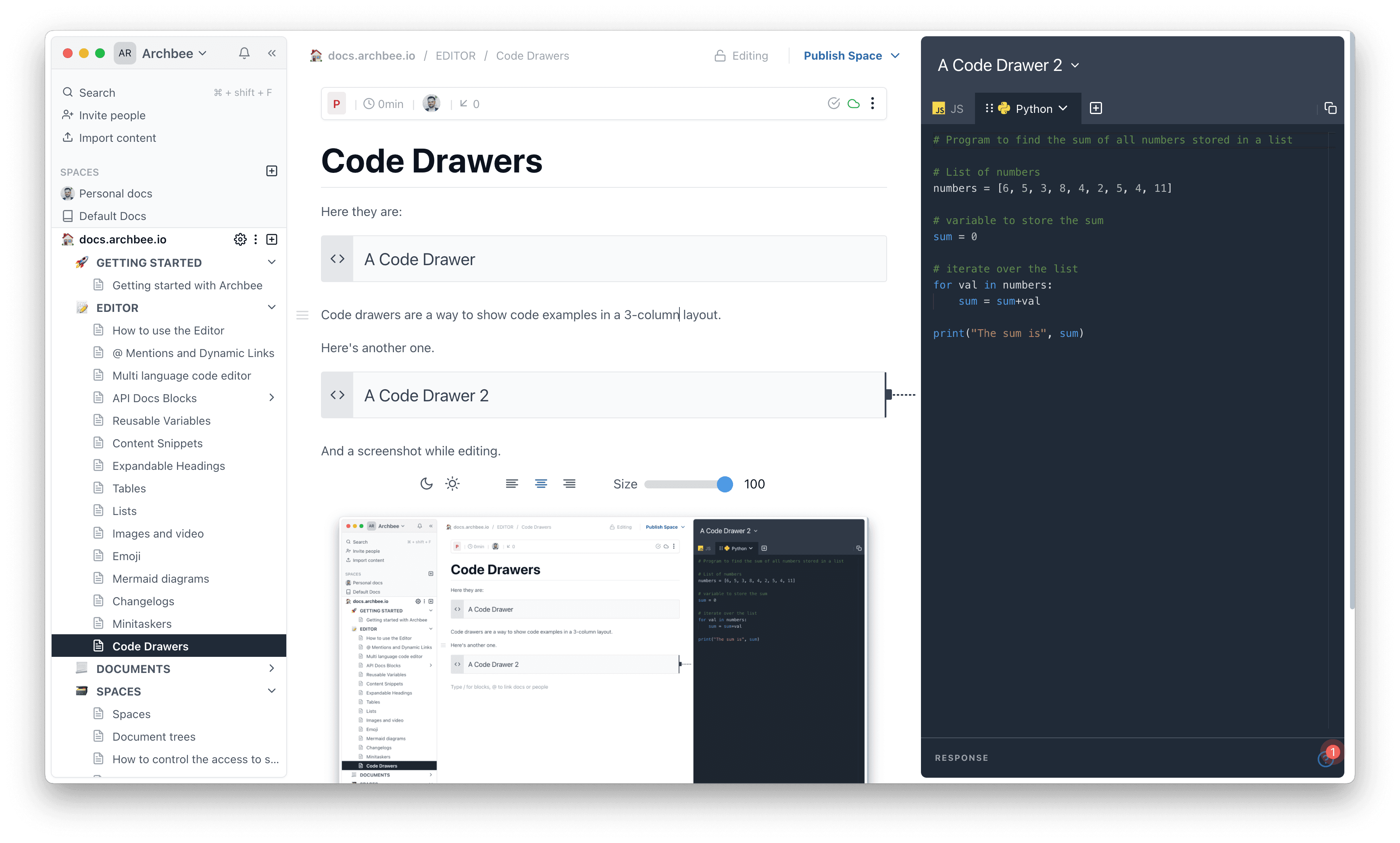 This new layout automatically appears when blocks like `API Endpoint`, `OpenAPI` and the new `Code Drawer` are available in the document.