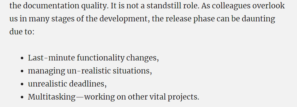 Michael Clark, a freelance technical writer, claims that the release phase seems daunting to technical writers because it frequently includes late functionality changes.