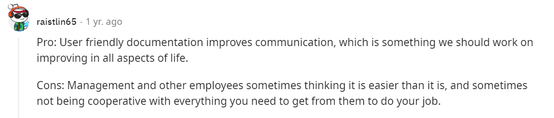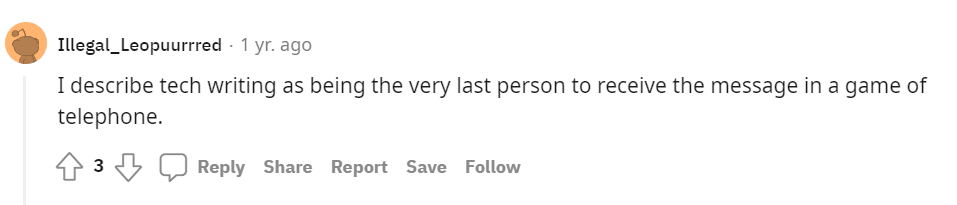 Additionally, some technical writers mentioned feeling underestimated. For instance, this Reddit poster claims that their coworkers think technical writing is easier than it is.