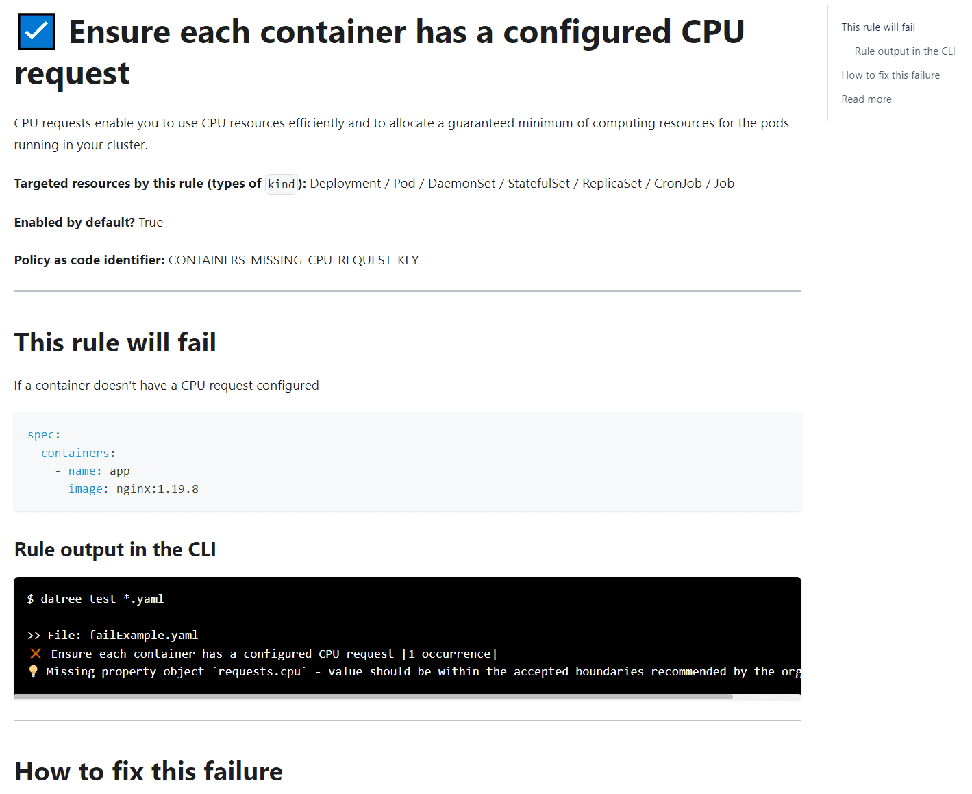 Datree, a CLI tool, has well-organized documentation that always follows the same structure. Let’s take a look at an overview of their built-in rules.