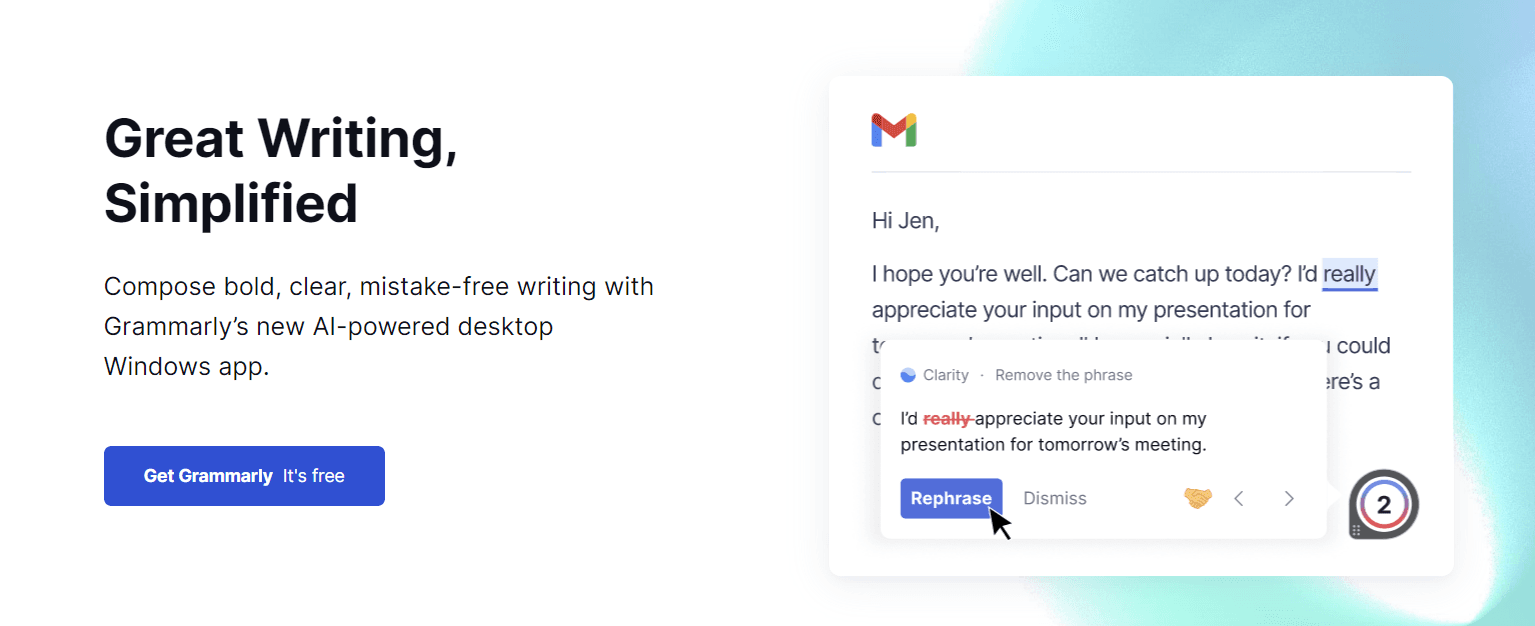 Grammarly checks for grammatical errors, punctuation, and spelling and gives suggestions regarding phrases, wording, and sentence structure.