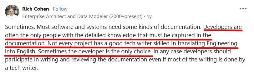 If, like Rich Cohen says above, “the developer is the only choice” for creating detailed and usable documentation, then it’s essential they’re skilled in it.