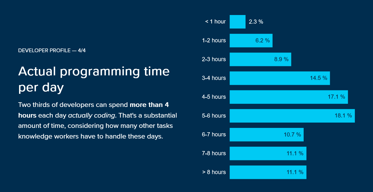 The data from the Mac Git Survey 2021 illustrates that well. As you can see below, most developers spend only about half of their time at work coding.