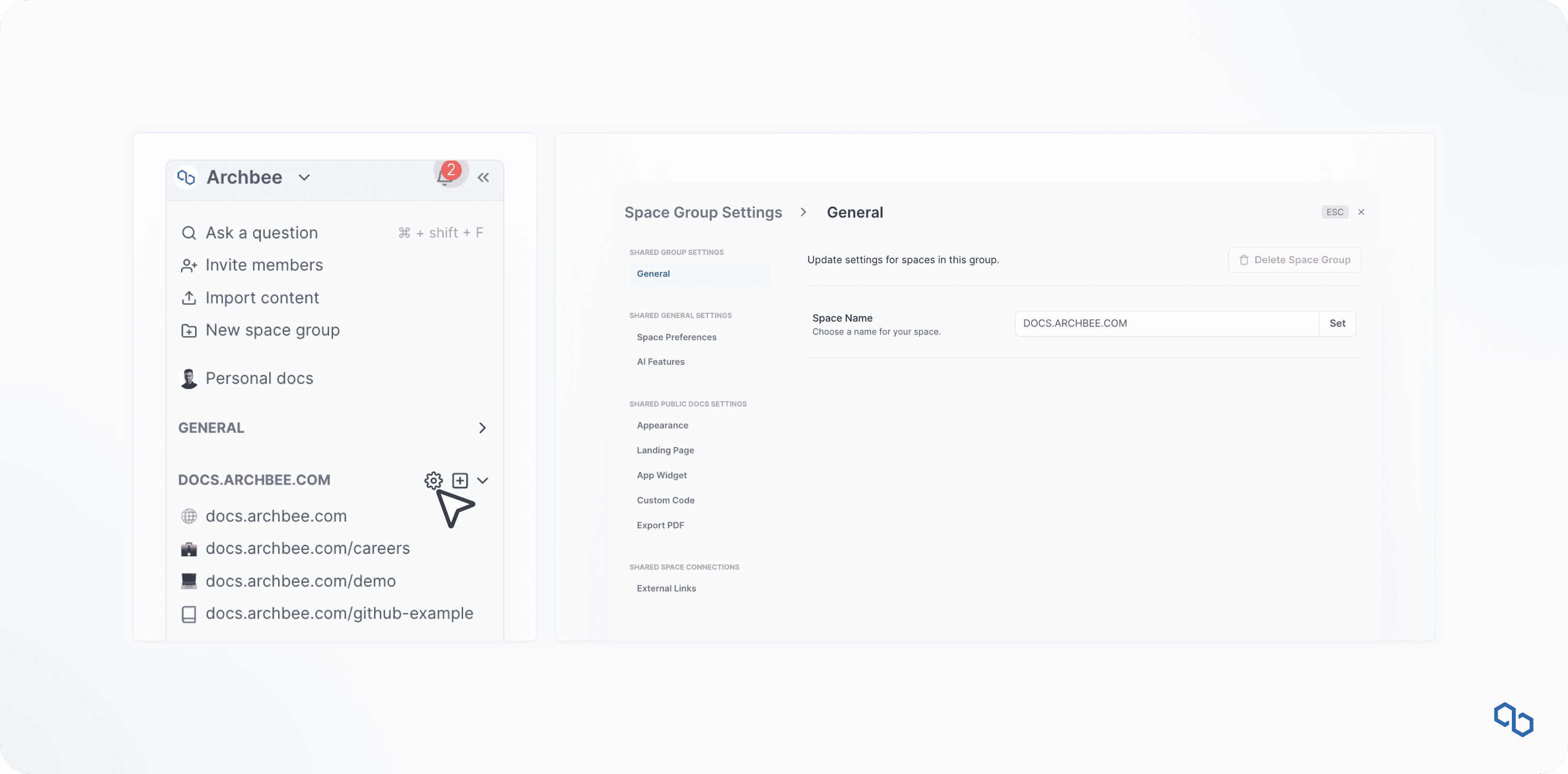 Say goodbye to tedious setting updates for each space in your group. We've introduced a dedicated settings section for your space groups. Now, you can sync all settings across your entire group, saving you precious time on large documentation sets.