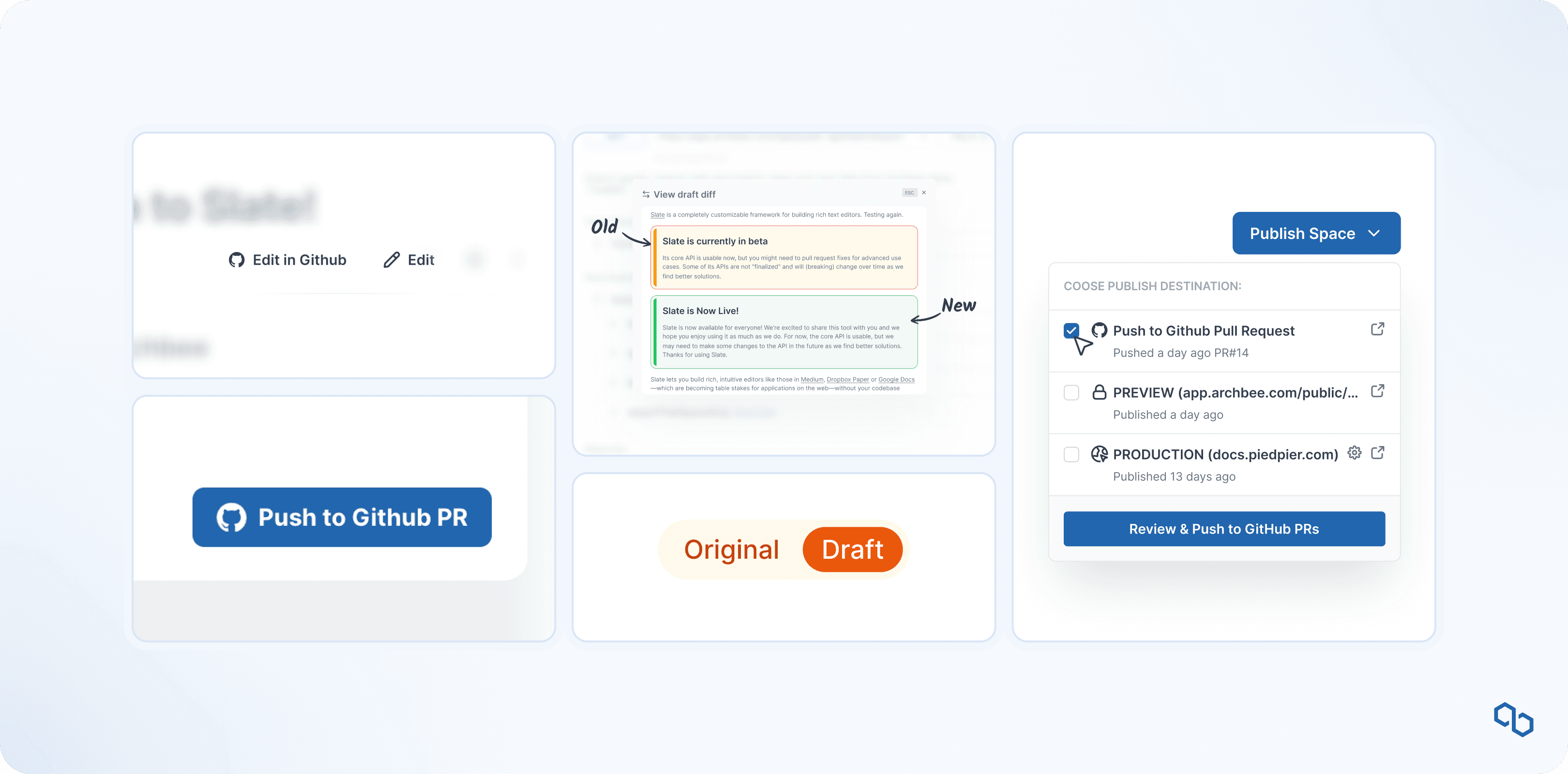 Until now, you could write your content in GitHub. It would get synced to our platform automatically. Now it's possible to also edit & push content from Archbee to GitHub via Pull Requests, making the loop complete.