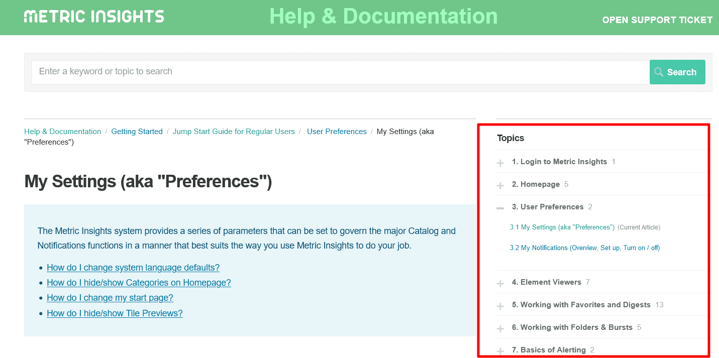For instance, the “Homepage Basics” article covers multiple topics, and there’s a table of contents at the top.