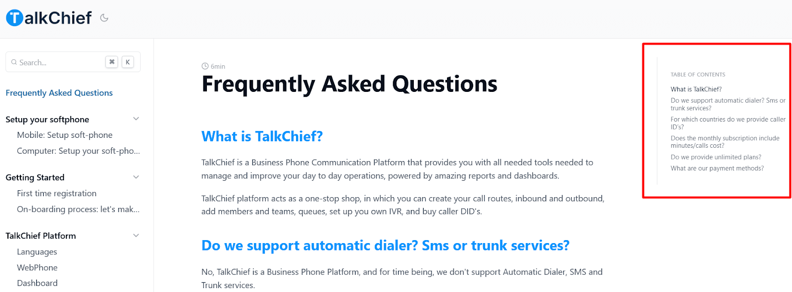 You can see what the table of contents looks like in TalkChief’s documentation built in Archbee.