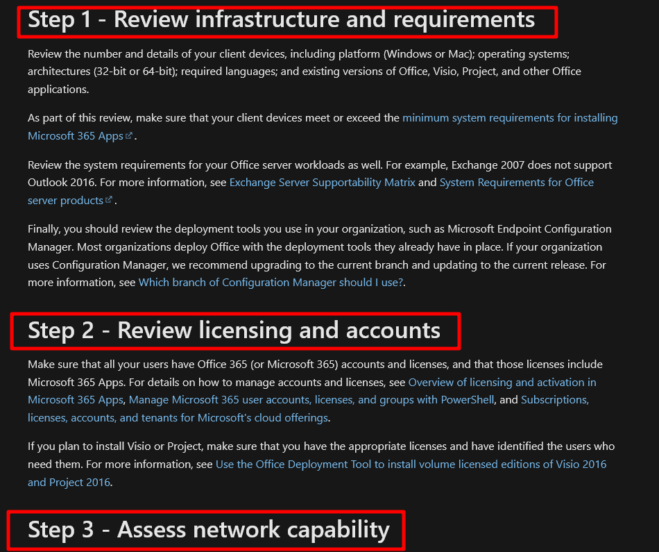 As you can see below, the section about assessing requirements and environment for deploying the apps is divided into steps.