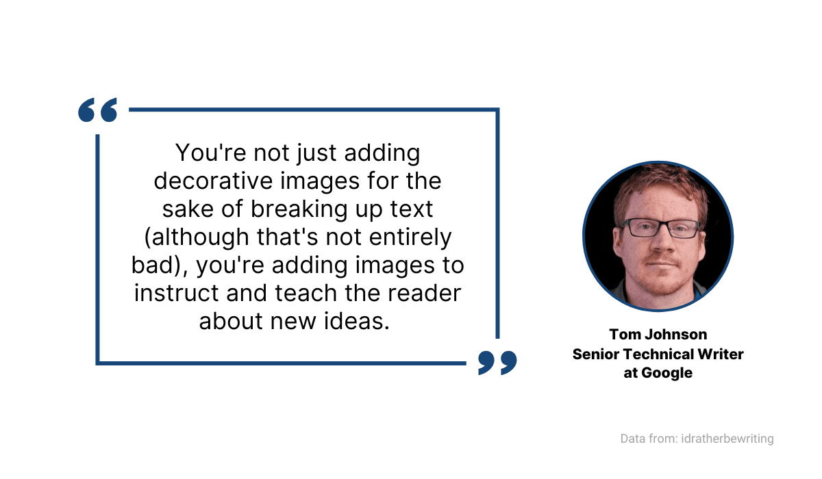 As Tom Johnson, an experienced technical writer and blogger, advises, visuals should provide extra value.
