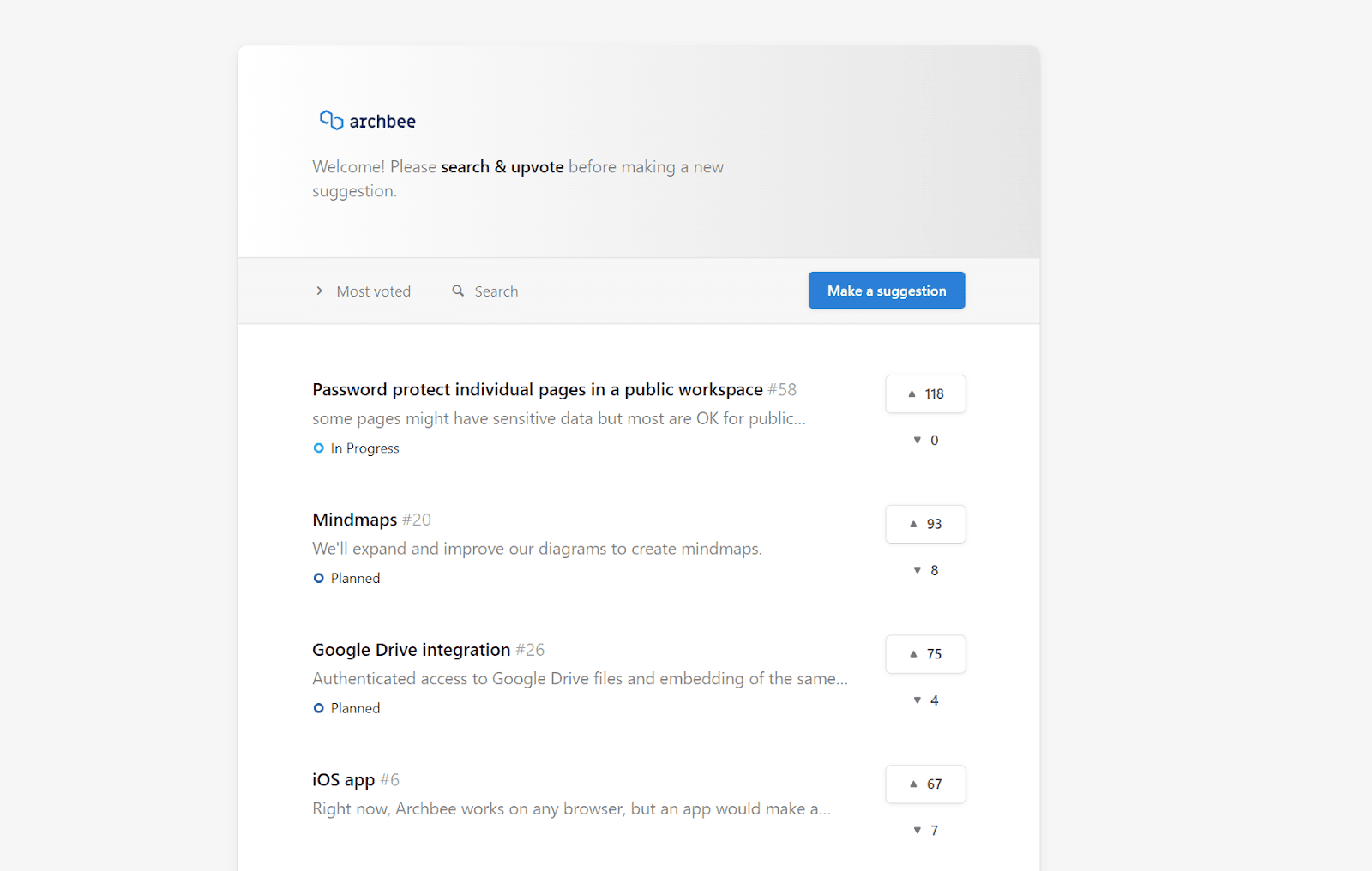 For example, at Archbee, we’ve implemented a roadmap feature where users can suggest changes to our documentation software and vote on the updates they want to see in the software.