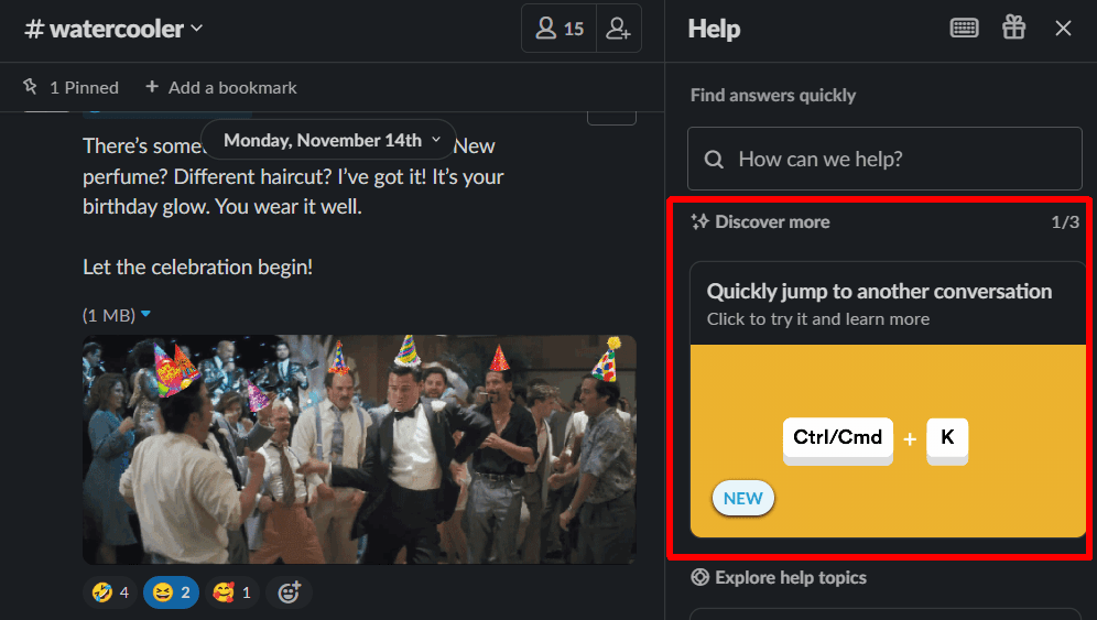 For example, take a look at the helpful pop-up in Slack that concisely explains a recently-added feature.