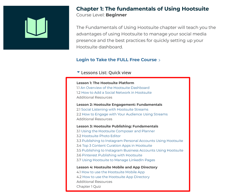 Below, you can see the structure of their course about the fundamentals of Hootsuite.