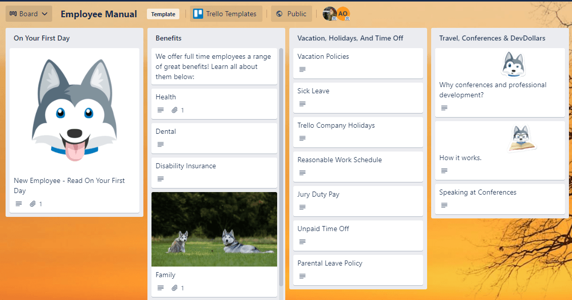 Instead of organizing information by departments, as many companies do, Trello have chosen to cover general topics like the first day, benefits, time off, and travel, among other things.