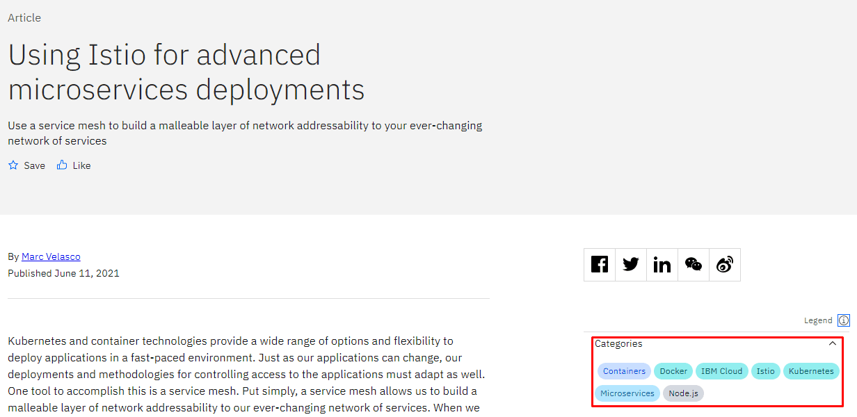 For example, the article “Using Istio for advanced microservices deployments” is shown under seven categories, including Containers, Microservices, and Node.js.