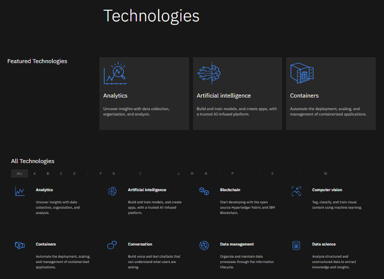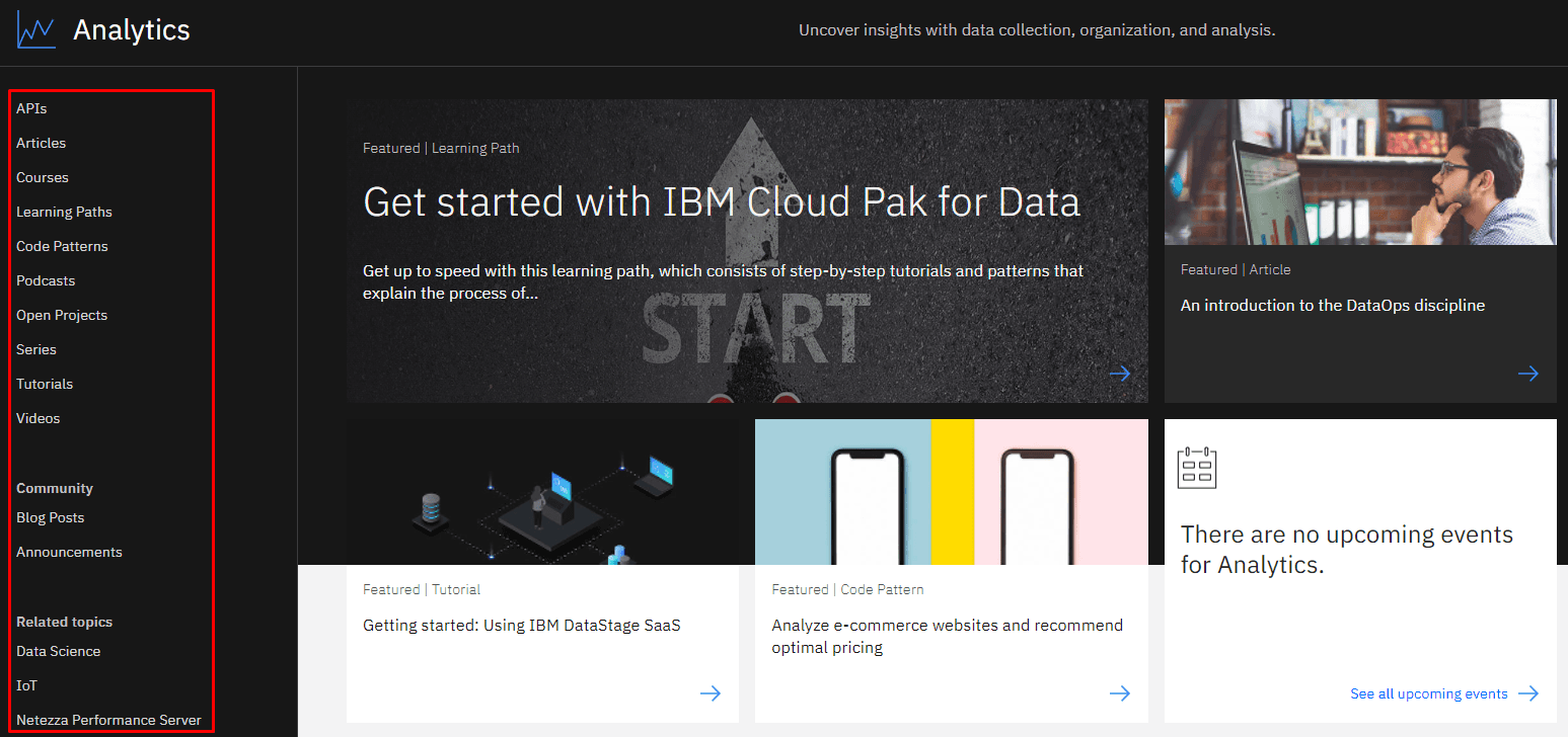 Visitors can decide whether they want to search through broader topics, explore IBM’s products and services, see different community content, or publicly available code documentation.