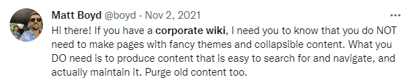 This disorganization and complexity might be why most employees who took part in a Twitter poll described their internal wiki as a “complete dumpster fire,” the opposite of helpful.