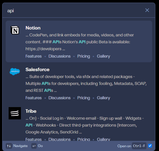 Capiche, for example, lets you search for a keyword in a pop-up window. We looked up the term “api” and got a couple of good hits.