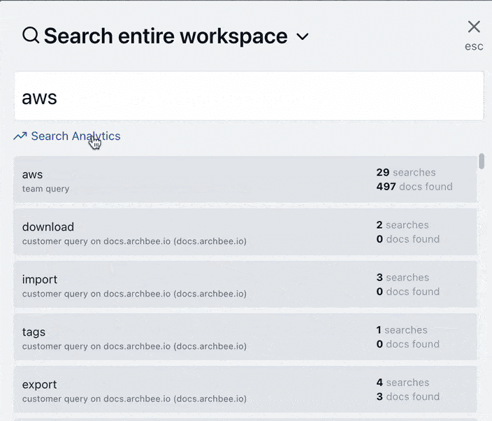 In the image above, you can see that Archbee search analytics show there were no documents found for the keywords “download”, “Import”, and “tags”. This means that the admins should add more content with these keywords, preferably giving more information on how to use these options.