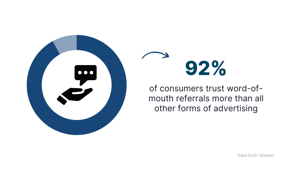 For instance, a Nielsen report indicates that 92% of people trust word-of-mouth referrals more than all other forms of advertising.