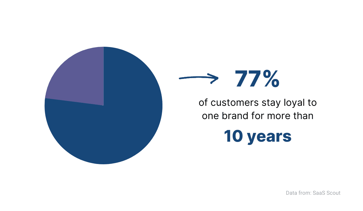 SaaS customers are also often inclined to stay with a single provider. According to data from SaaS Scout, 77% of customers stick with one brand for more than ten years.