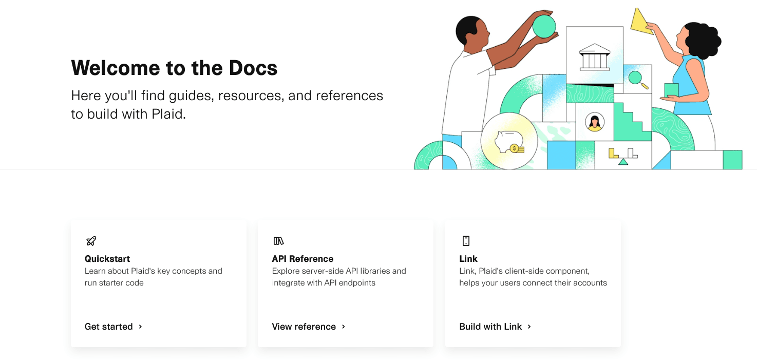 As you can see, there’s a link to a quickstart guide, API references, and Link, one of Plaid’s components.