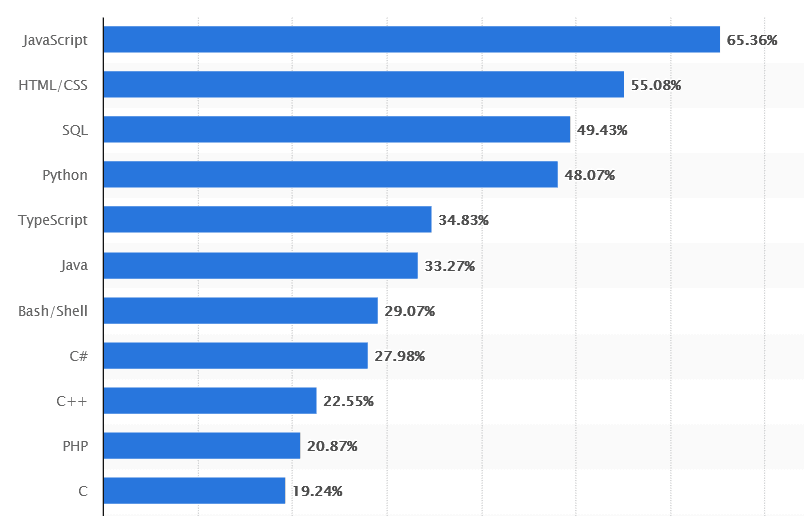 As you can see, the most popular programming languages worldwide are JavaScript, HTML/CSS, SQL and Python.