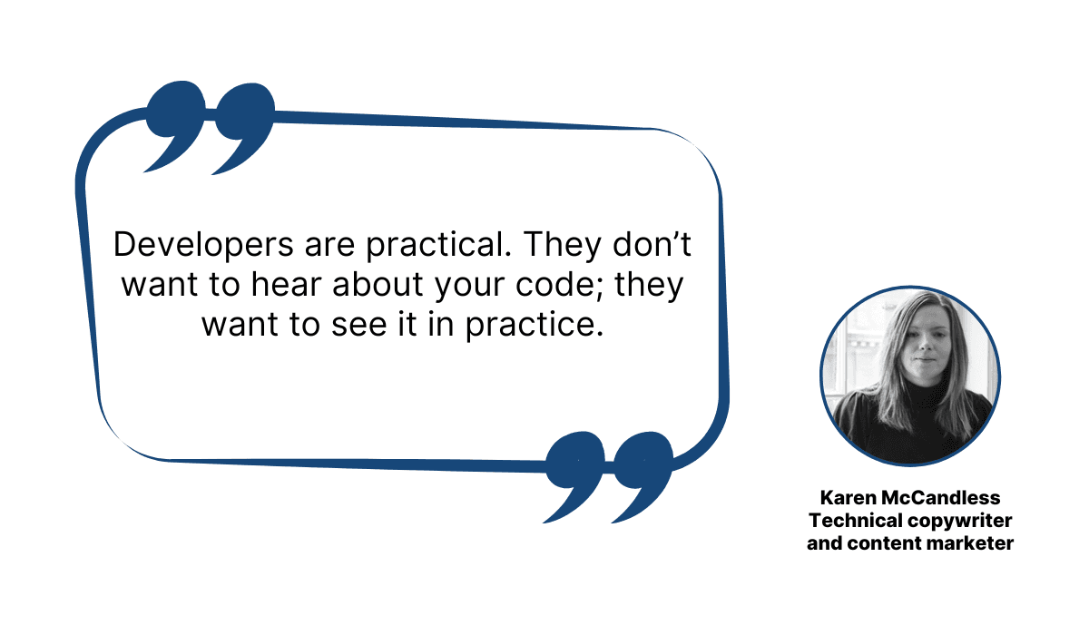 As Karen McCandless, a technical copywriter and content marketer, points out, developers want to see the code in action.