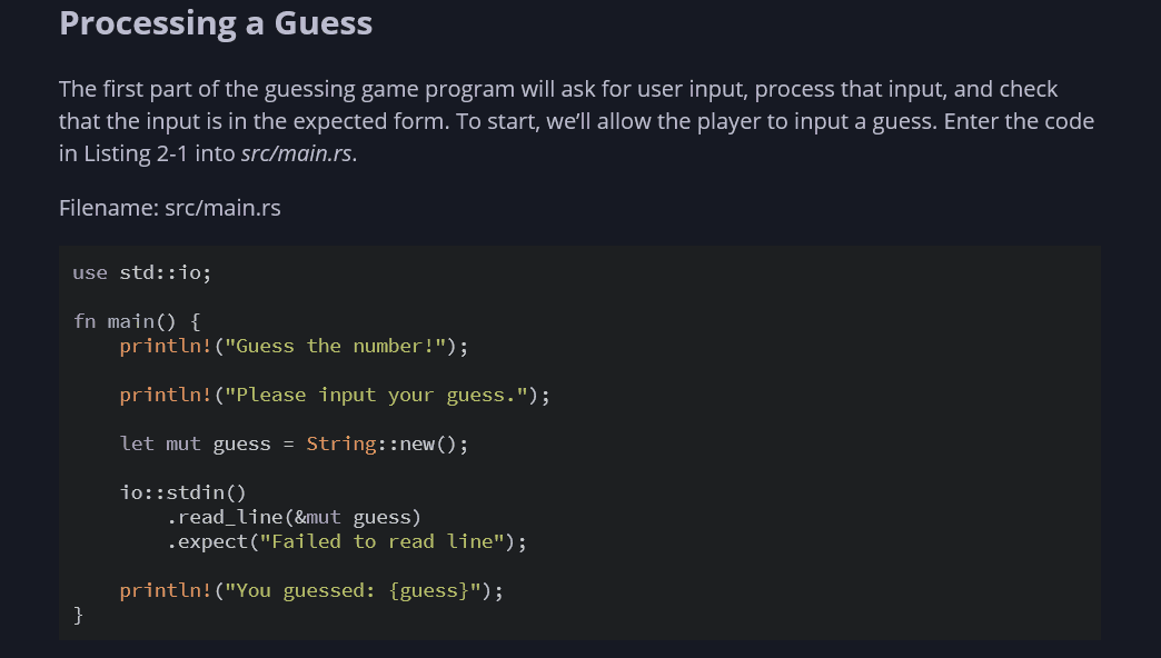 For example, the Rust programming language documentation gives developers a project to work on—in the form of a guessing game.