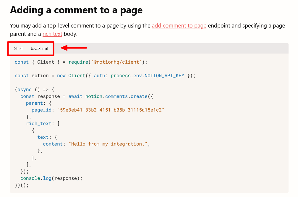 For example, you can have tabs containing samples for different programming languages, like in Notion’s documentation.