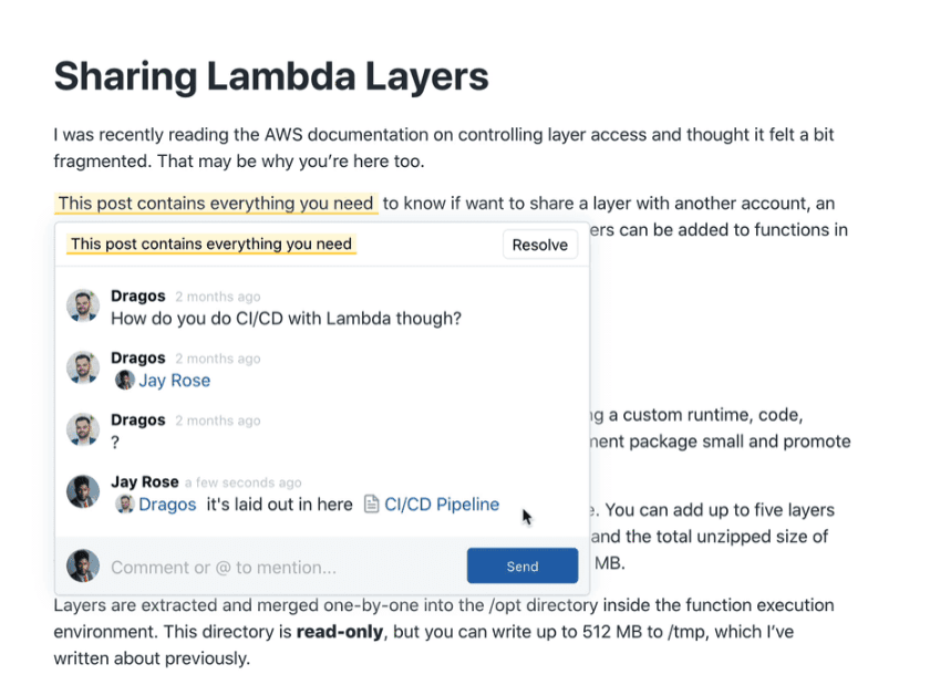 - @mentions with notifications: Tag teammates and they’ll get alerted to jump straight to the right spot.