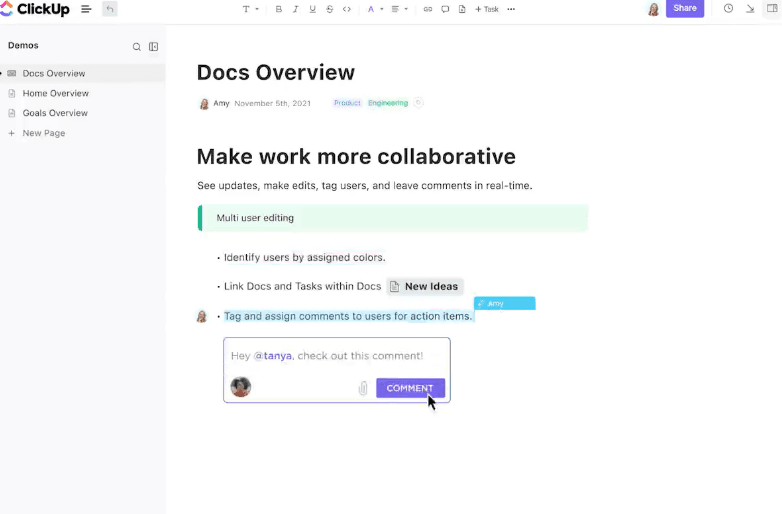 ClickUp allows you to work with your team on documents in real time, write comments and tag team members, as well as connect documents and tasks.