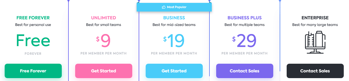 You can get ClickUp for Free with limited options. In addition to that, there are four more paid plans to choose from.