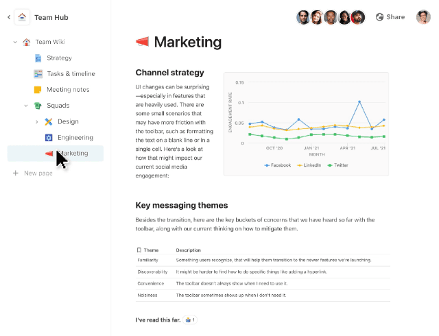 All the collaboration happens in workspaces, which you can create and invite team members you want to collaborate with on a particular document.