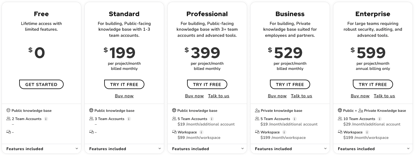In addition to a free plan that allows you only one public knowledge base, 50 articles, and 1 GB of storage, other plans can go up to $599 per project per month.