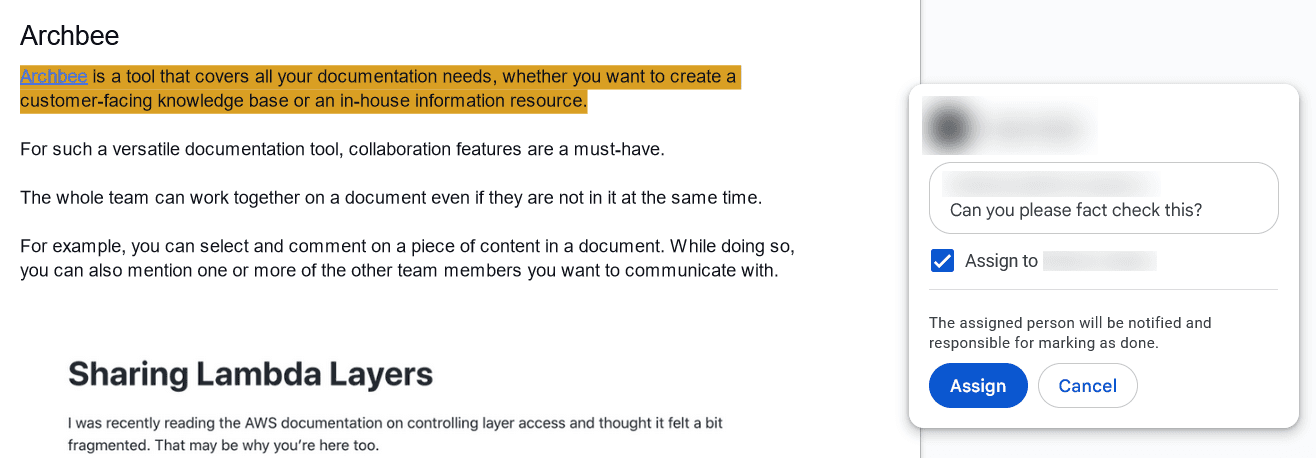 Another valuable collaboration feature is adding comments to the document and assigning them to your team members.