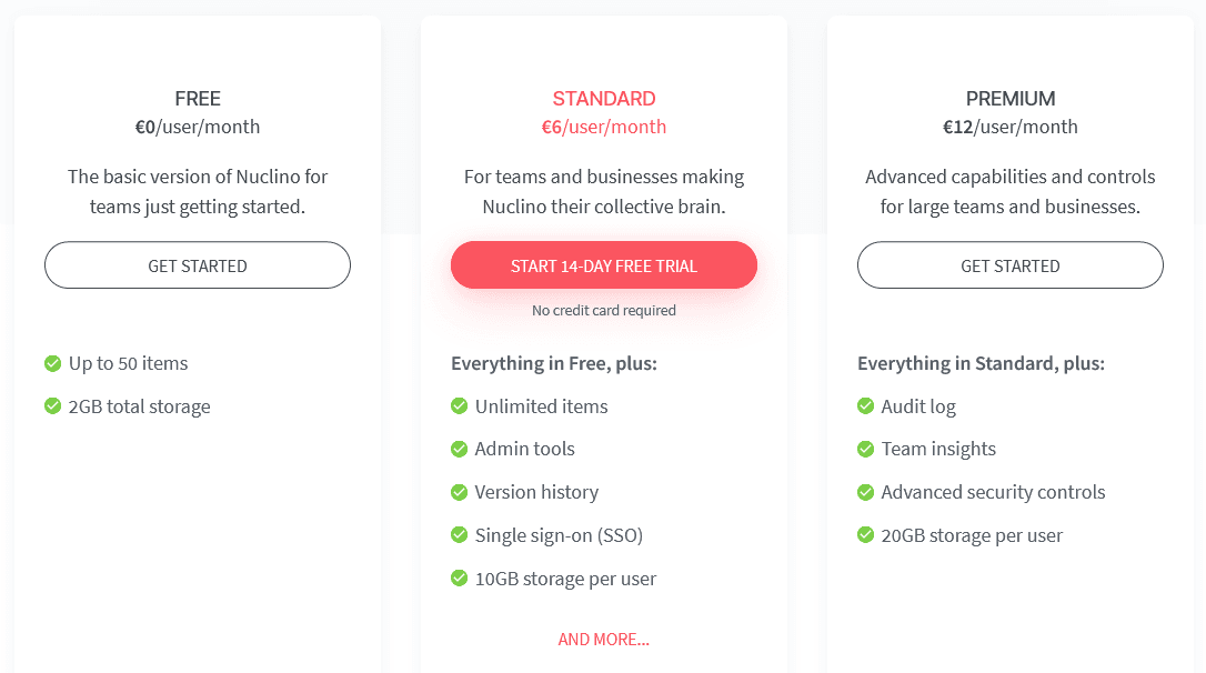 Nuclino is free if you want to try it out, but most of the features are available in paid plans, like, for instance, version history, which we mentioned earlier.
